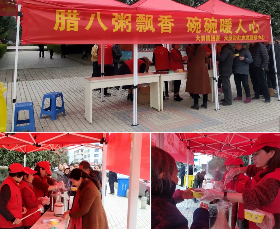 1月13日,腊八节,大溪镇团委、宣传办、妇联、彩虹志愿服务中心共同开展“腊八粥飘香碗碗暖人心”活动,志愿者连夜熬制5000余碗腊八粥分发给群众,在严寒的腊八,让群众享受美食、感受温暖。